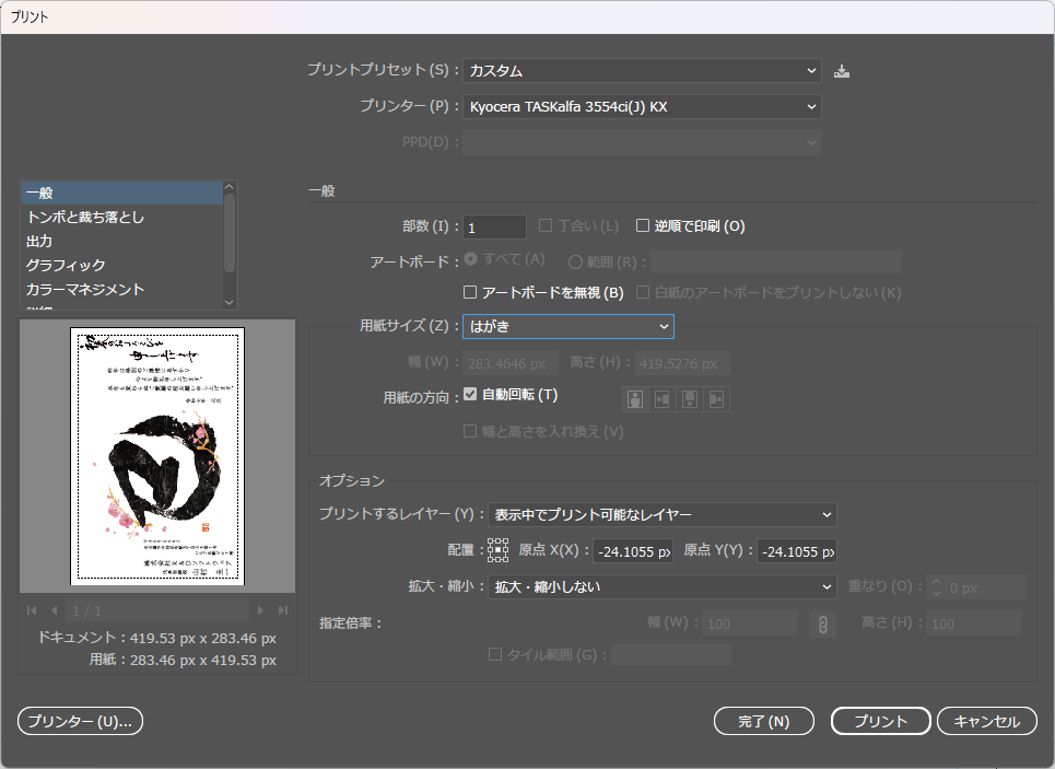 「ファイル>プリント」からプリントダイアログを開き、下記と同じように設定する。