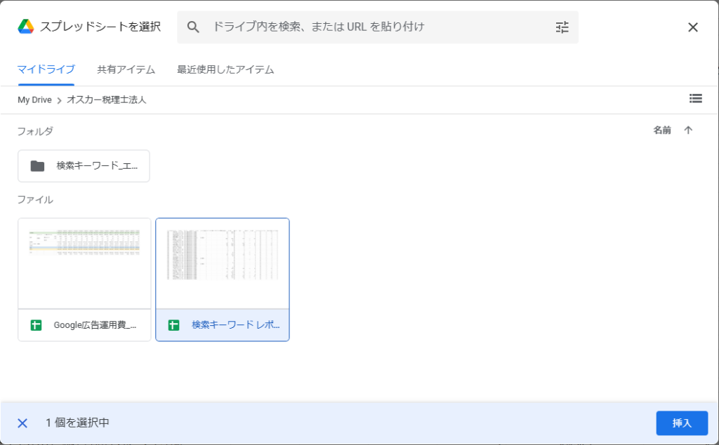 フォルダはマイドライブ>クライアント名の中に「検索キーワード_エクスポート用」があるのでそれを選択。